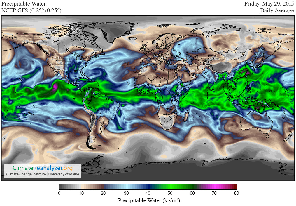 What we see now is a summer monsoon storm season that is wildly more powerful than normal because of the evaporation of water caused by the heat pools in the eastern Pacific, including the building El Nino. That moist air flows over southern Mexico then shunts north, though Texas and into the central US, in part because the jet stream is not pushing it east as it would normally do. In this process, tropical levels of atmospheric moisture are brought far north, where they meet fronts of relatively cooler air, which causes rain to form in buckets. Below is a representation of levels of atmospheric humidity. Note that there are bands of moisture in the central US (dark blue and green) that are otherwise only found in the tropics on the map. Note also that the ridge of pressure of the western US coast is keeping all of the air over the western US very dry indeed. Note also that the one spot of really, really humid air (purple) is off the coast of Southern Mexico, right over one of the warm pools.